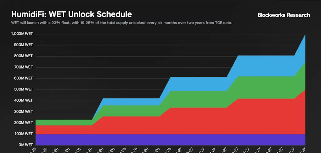 WET será lançado com um float de 23%, reminiscentes dos lançamentos de tokens de baixo float e alta FDV que historicamente atormentaram o Solana DeFi. É surpreendente que a equipe Temporal tenha decidido lançar com um baixo float, dado como o mercado puniu esses tokens nos últimos dois anos. 19,25% do fornecimento total (192,5 milhões de tokens) serão desbloqueados a cada seis meses ao longo de dois anos a partir do TGE.