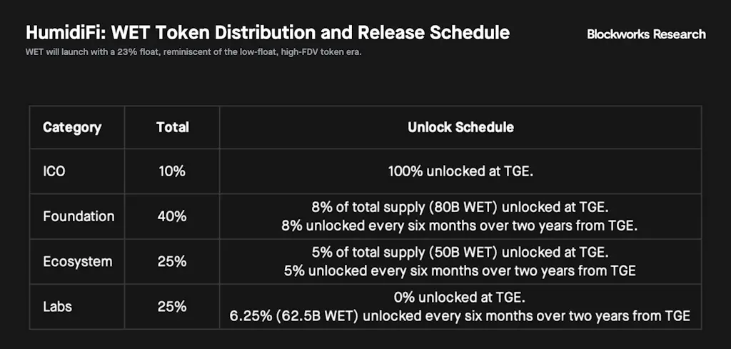 A distribuição de tokens do WET mostra que 10% é alocado para participantes do ICO, com os 90% restantes distribuídos entre a Zero Position Foundation (40%), Ecossistema (25%) e Labs (25%). Presumivelmente, a Fundação será gerida pela Temporal, embora o anúncio nunca atribua a operação da Zero Position a qualquer entidade específica, deixando esta informação não divulgada um dia antes do ICO. A alocação para Labs provavelmente se refere à Temporal também, dada a sua função como contribuinte principal de engenharia da HumidiFi.