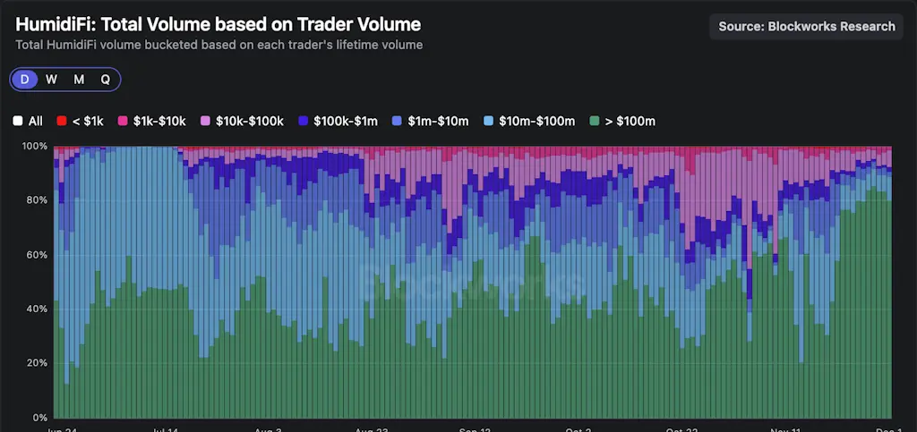 Uma captura de tela foi feita em 11 de novembro para determinar a alocação da pré-venda reservada para os usuários da HumidiFi. Os traders com um volume de vida superior a $100 milhões têm historicamente representado mais de 50% dos volumes diários da HumidiFi. Essas carteiras são mais provavelmente criadores de mercado e bots de arbitragem, e provavelmente estarão na lista branca para a venda.