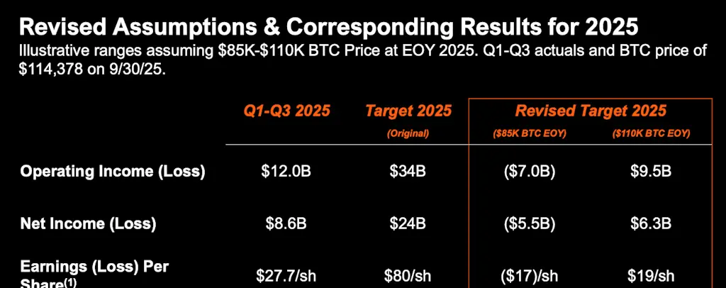 A gestão reduziu a sua suposição de preço do BTC para o final do ano de $150K para uma faixa entre $85K e $110K, diminuindo a sua meta de ganho em dólares com BTC para cerca de $8,4 bilhões–$12,8 bilhões e tornando os lucros GAAP do ano inteiro altamente sensíveis ao preço final do BTC. Na chamada com os investidores, destacaram que um preço do BTC no final do ano abaixo de aproximadamente $94K significaria operar com perdas líquidas, enquanto um preço acima de $94K suportaria uma renda positiva.