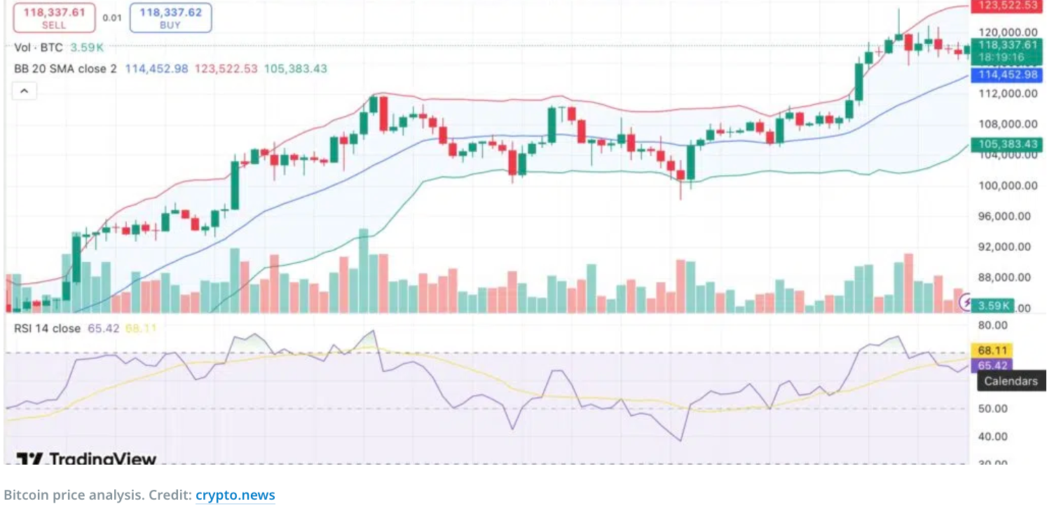 Технические индикаторы показывают ослабление рыночной динамики С технической точки зрения, дневной график Биткойна показывает, что краткосрочная ценовая динамика ослабла. Цена находится близко к средней линии полосы Боллинджера, в то время как поддержка 20-дневной простой скользящей средней (SMA) составляет примерно 114,453 долларов, а поддержка нижней границы находится на уровне 105,383 долларов, тогда как сопротивление верхней границы составляет 123,522 долларов. Если Биткойн пробьет среднюю линию и SMA, это может поставить под сомнение поддержку в районе 105K.
