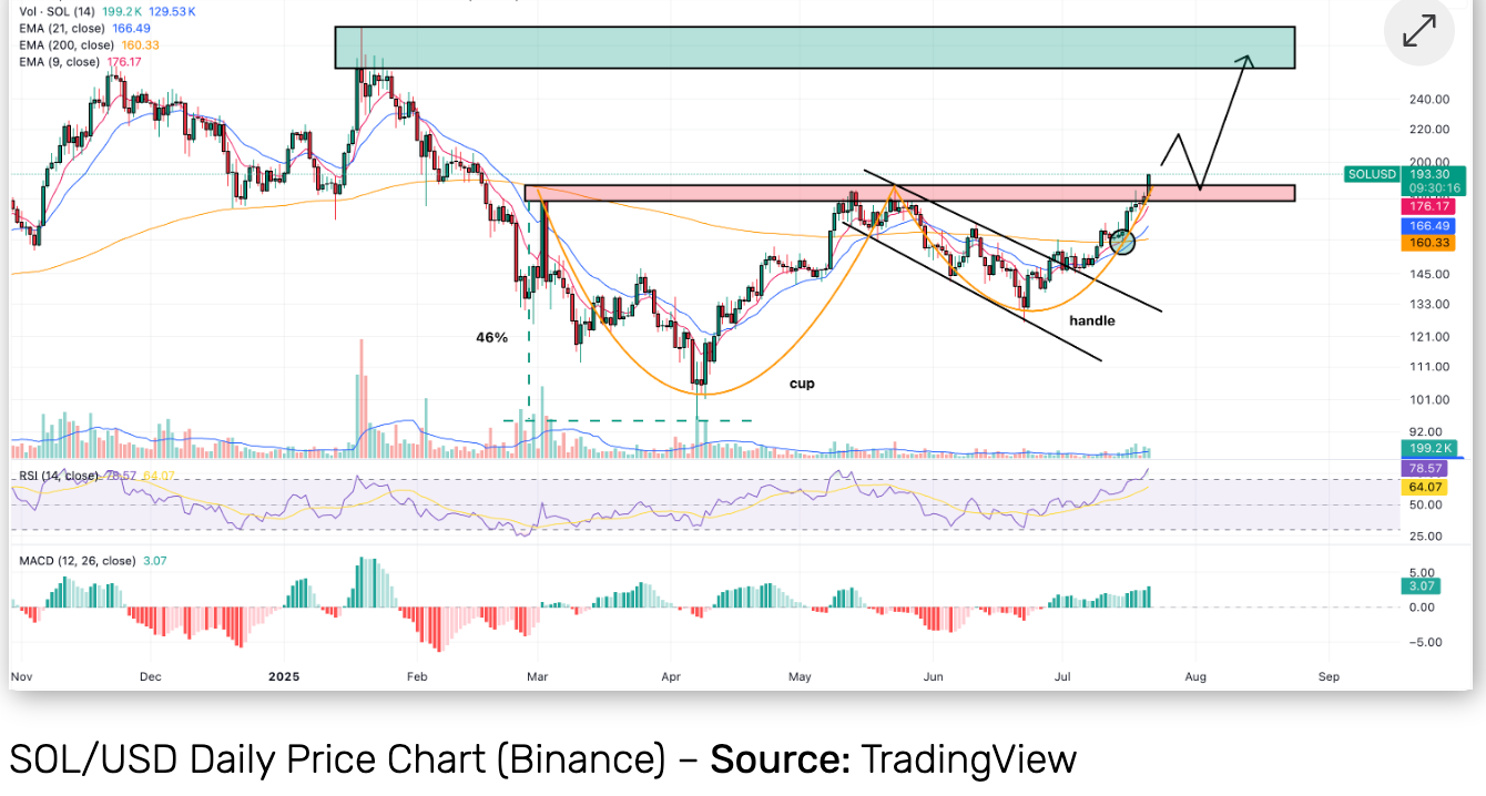 Эффективный прорыв нисходящего канала: SOL успешно пробил нисходящий трендовый канал, сформированный с конца мая на уровне 190 долларов, прорыв сопровождался значительным объемом и подтверждением паттерна золотой крест на 9/21 EMA.
