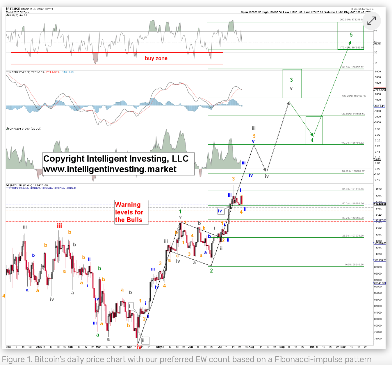 Текущая консолидация Биткойна была точно определена как коррекция четвертой волны (оранжевая волна-4) и является лишь промежуточной станцией перед атакой на 136000 долларов. Технический анализ показывает, что с момента старта серой первой волны (W-i) на минимуме 22 июня и серой третьей волны (W-iii) на максимуме 123200 долларов 14 июля все прогнозы были идеально выполнены. После завершения текущей консолидации, оранжевая пятая волна (W-5), которая вот-вот начнется, подтолкнет цену к цели 136000 долларов, которая также соответствует цели пробоя бычьего флага и 100% уровня расширения Фибоначчи зеленой третьей волны (W-3). Более крупный цикл сохраняет целевой диапазон на конец года от 164000 до 216000 долларов.