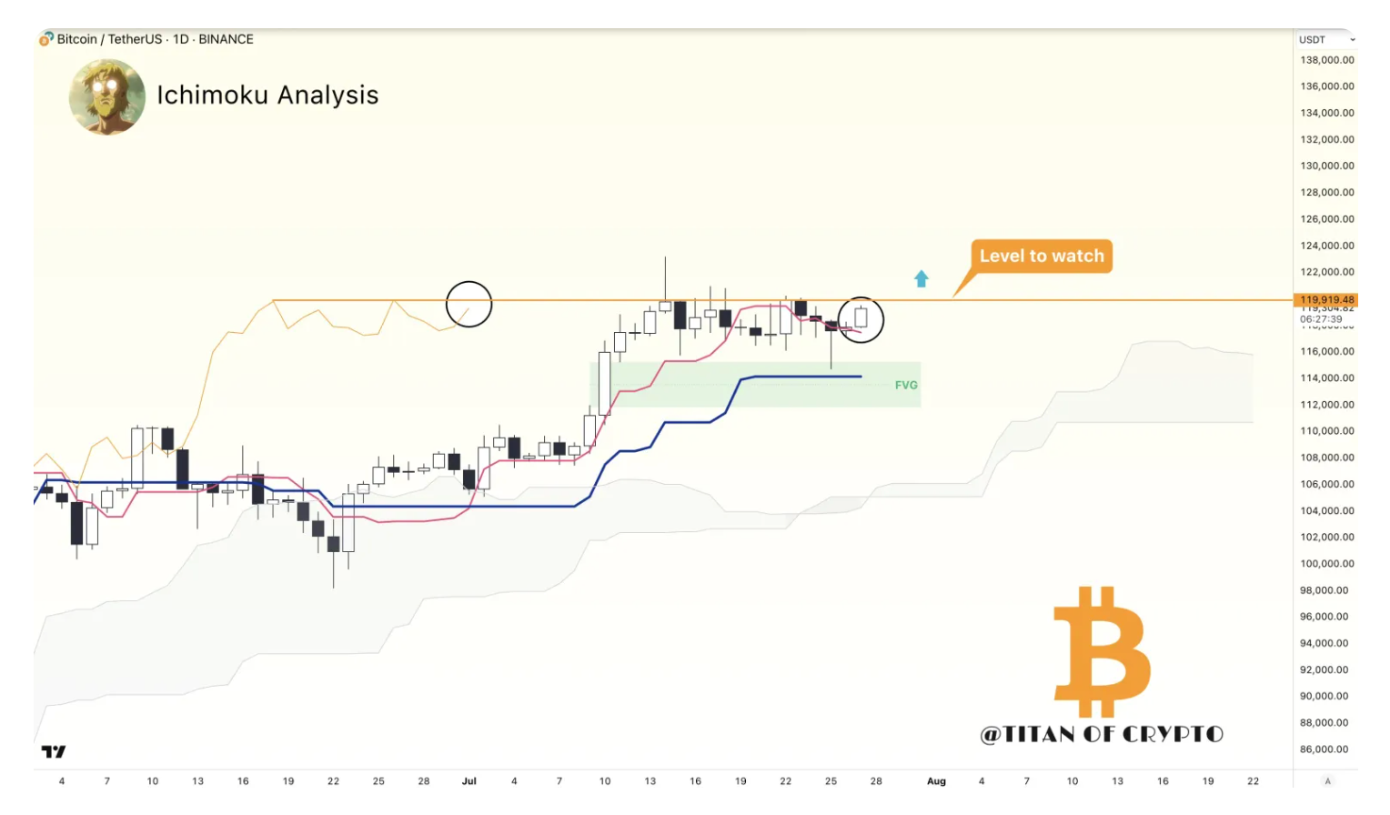 Другой аналитик Titan of Crypto добавил, что если BTC сможет сильно преодолеть уровень в 119,900 долларов, это может открыть новый цикл роста и обновить исторический максимум (ATH).