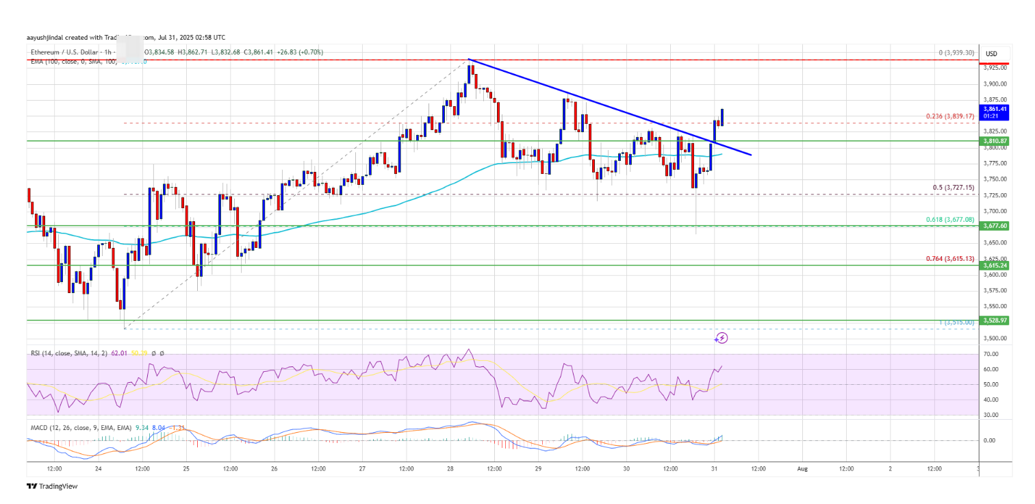 На момент анализа цена ETH стабильно находилась выше 3820 долларов и 100-часовой скользящей средней, демонстрируя бычью тенденцию.