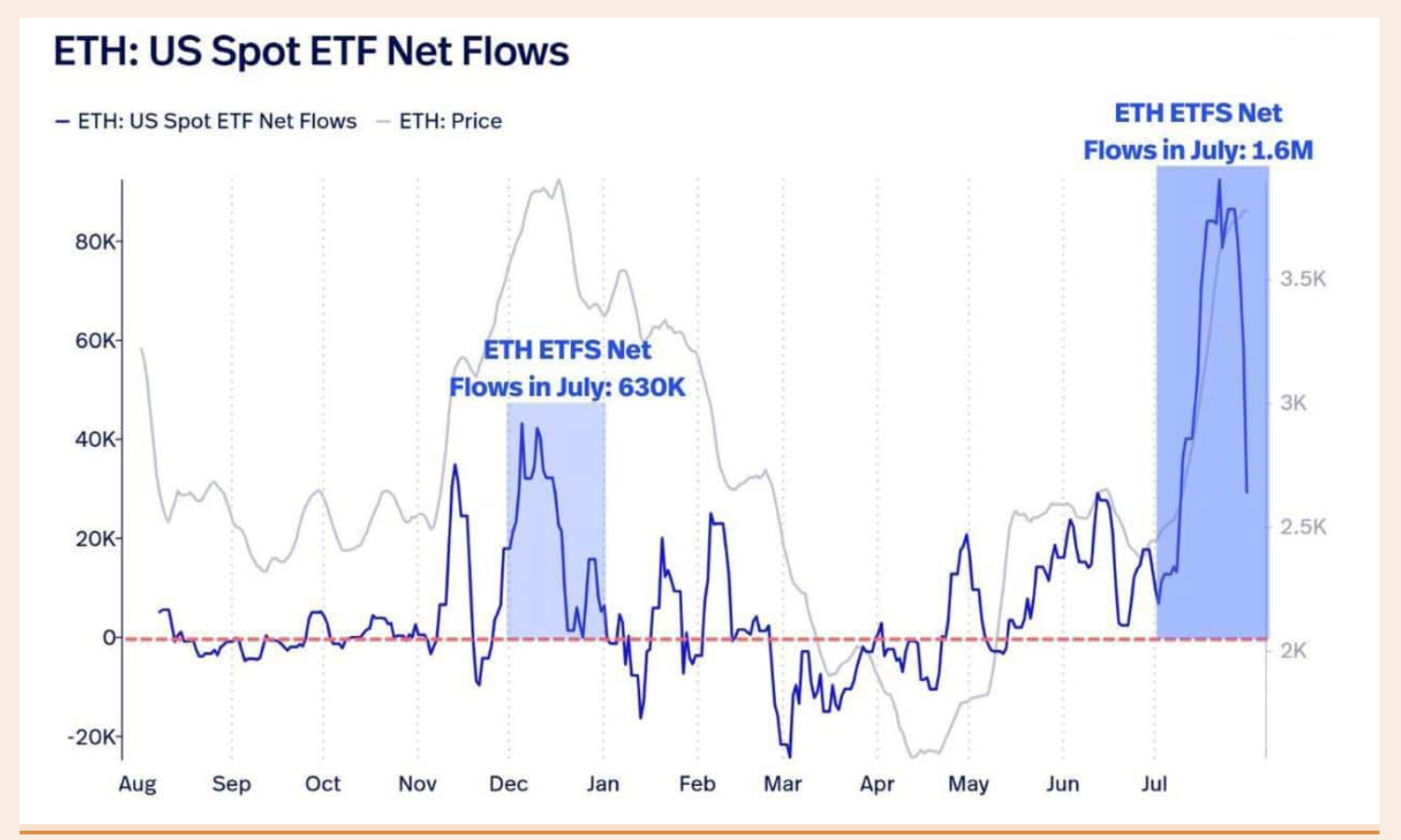 ETF гигантские закупки: Официальные данные показывают, что в июле в спотовый ETF Ethereum зафиксировано чистый приток 1.6 миллиона ETH.