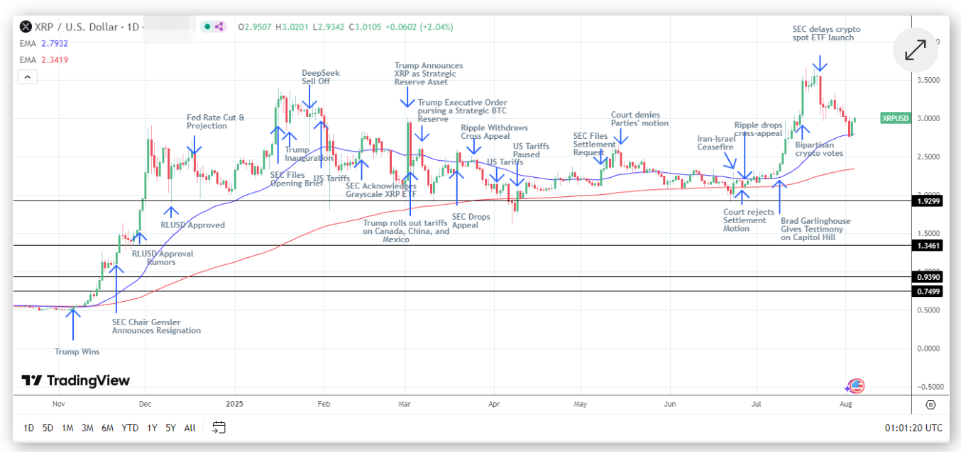 Недавние результаты: XRP завершил четырехдневное падение 3 августа, сильно отскочив на 6,61%, закрывшись на уровне $2,9503, значительно опередив рынок (+2,06%).