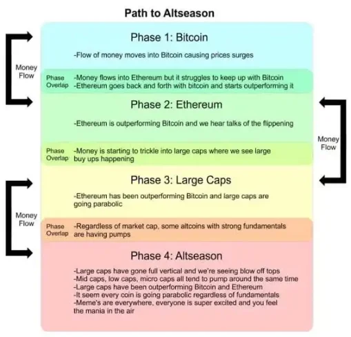 Запуск процессов альткоинов обычно выглядит следующим образом: рост биткойна (BTC) → рост эфира (ETH) → новый рывок BTC → прорыв ETH до исторического максимума (ATH) → рост альткойнов с большой капитализацией → новый максимум BTC → ETH и альткойны с большой капитализацией достигают новых максимумов → взлет альткойнов со средней капитализацией → полное всплеск альткойнов с малой капитализацией