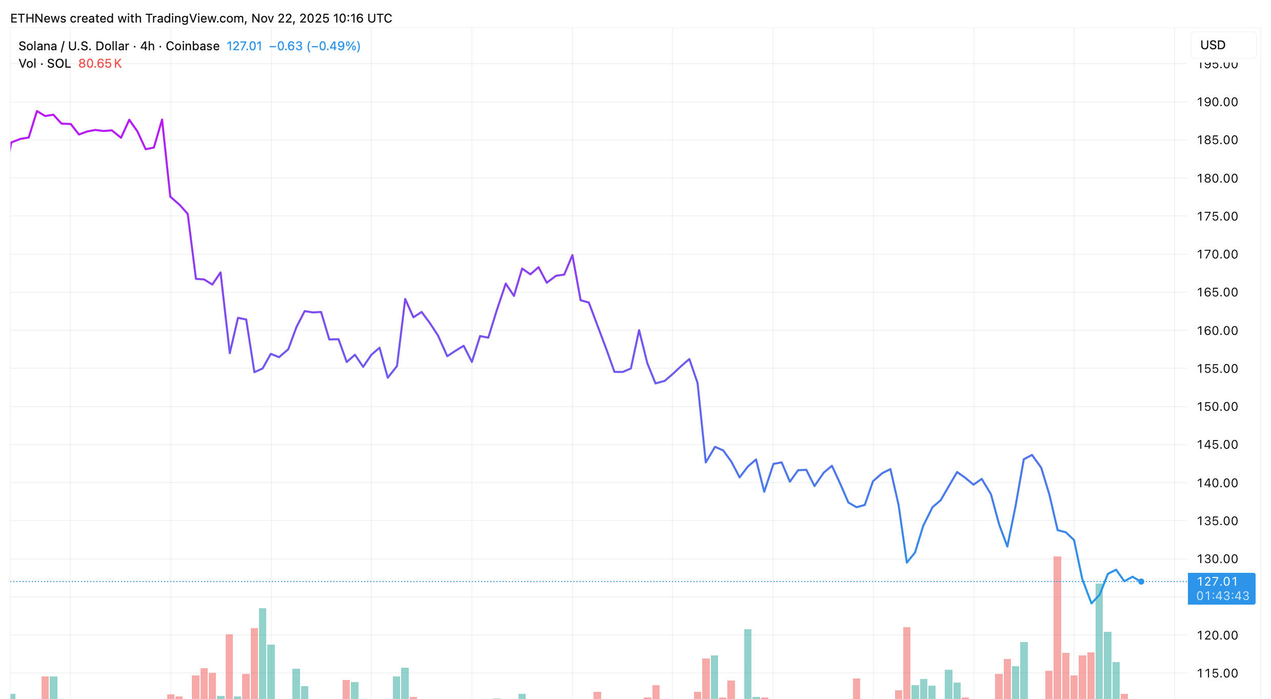 Солана провела большую часть ноября под сильным давлением, но новые данные предполагают, что тренд может меняться. Актив торгуется около $127, продлевая многонедельное снижение, которое опустило SOL почти на 50% ниже своего сентябрьского пика. Тем не менее, несмотря на снижение, свежие ончейн метрики и краткосрочные прогнозы указывают на ранние признаки улучшения импульса.