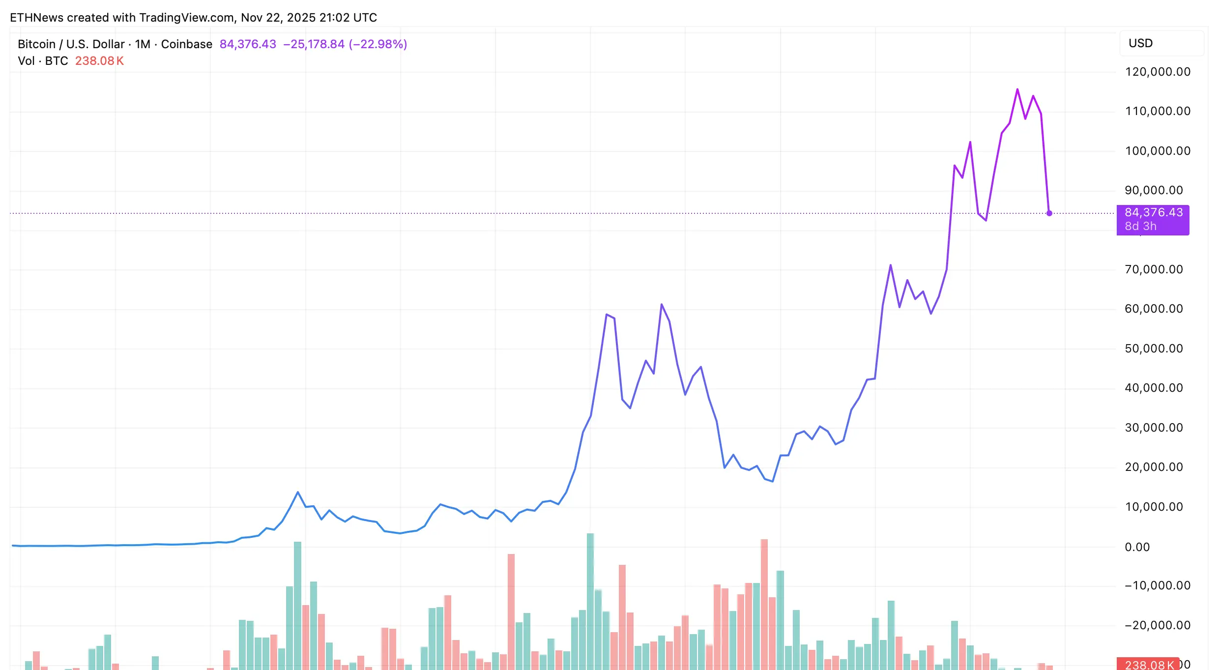 Последняя месячная свеча показывает, что Биткойн упал до примерно $84,370, что является значительной коррекцией от пиков цикла выше $120,000. Объем торгов остается высоким, что указывает на активное участие и высокую волатильность, типичную для коррекций на поздних этапах цикла, прежде чем цена найдет свой следующий стабильный диапазон.