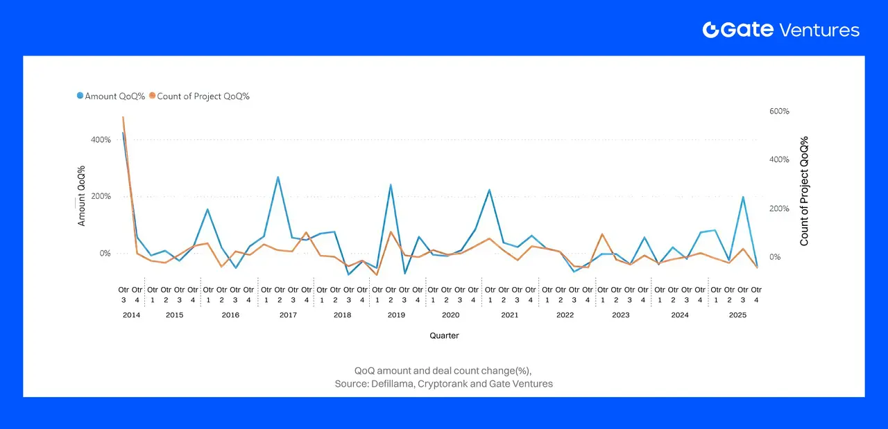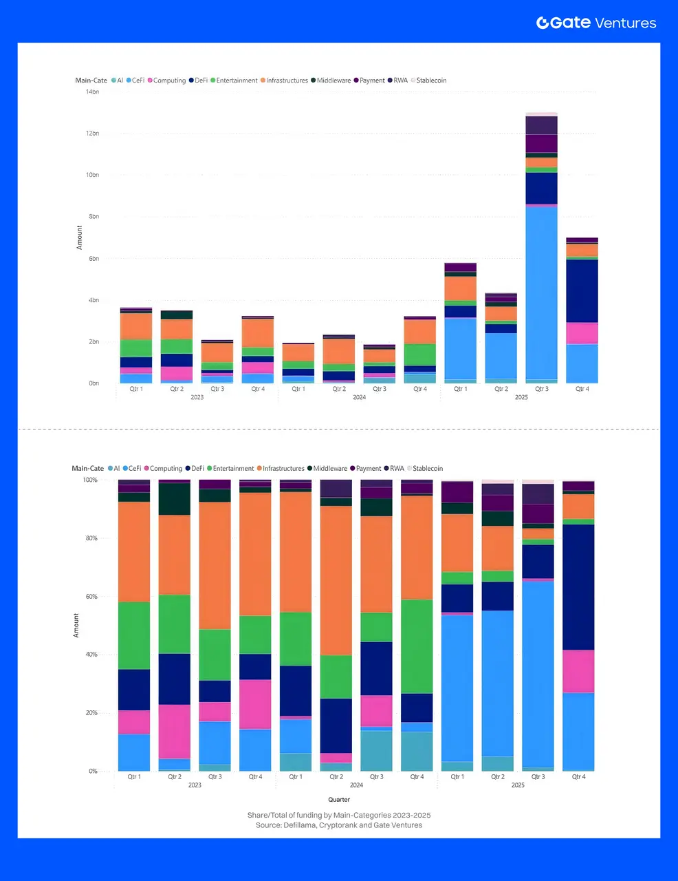 Рынок явно раскололся. Ведущие вертикали с высокой уверенностью и доходностью — стейблкоины/RWA, инфраструктура L1/L2, биржевые инфраструктуры, соответствие и безопасность — привлекли самые крупные чеки, тогда как спекулятивные нарративы цикла 2021 года привлекли только избирательное финансирование. Капитал перешел от хайпа к функциональной, регулируемой и готовой к институциональному использованию инфраструктуре.