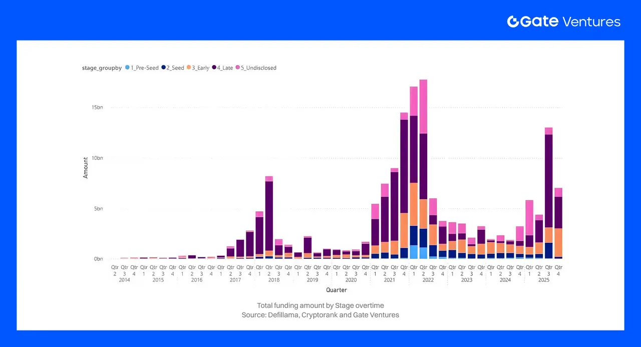 Восстановление 2025 года — на пути к $30 млрд+ — сигнализирует о выходе крипто-рынка из зимы, но с совершенно иным характером: больше внимания поздним стадиям, более тщательной проверке и акценте на качестве сделок, а не их количестве. Как подробно описано ниже, инвесторы в 2025 году сосредоточились на определенных секторах и стадиях, поддерживая меньшие по численности, но более сильные проекты, и готовясь к следующему циклу роста в 2026 и далее.