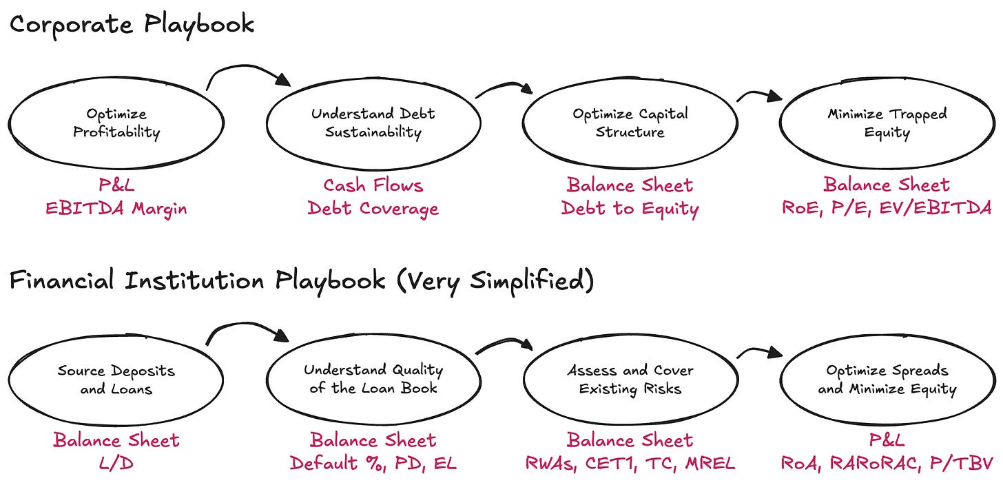 Effectively, understanding financial institutions requires flipping the corporate logic on its head. Rather than starting from the P&L, you start from the balance sheet—and ignore cash flows. And debt, far from being a constraint, is the raw material of the business. What matters is how assets and liabilities are arranged, whether there is enough capital for rainy days, and whether there is enough return left for those capital providers.