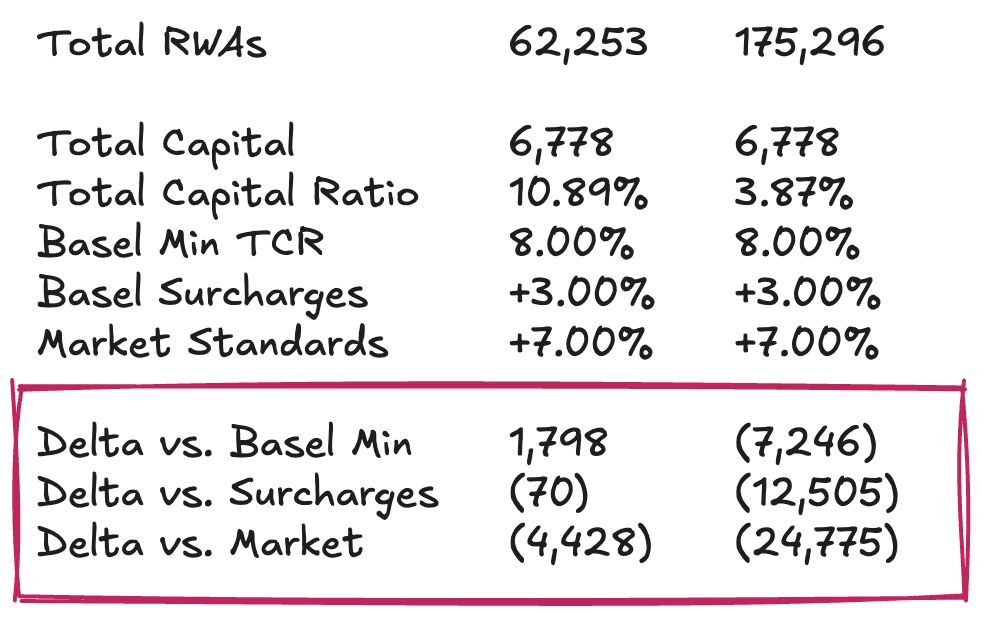 We can now add the last piece and look at Tether’s equity, or excess reserves, not in absolute terms, but relative to its RWAs. In other words: what is Tether’s Total Capital Ratio—TCR, and how does it compare to regulatory minima and market practice? This is where the exercise becomes more opinionated. For this reason, my aim is not to deliver a definitive verdict on whether Tether has enough capital to comfort $USDT holders, but rather to offer a framework that allowing the audience to break the question into digestible parts and form an assessment in the absence of any formal prudential regime.