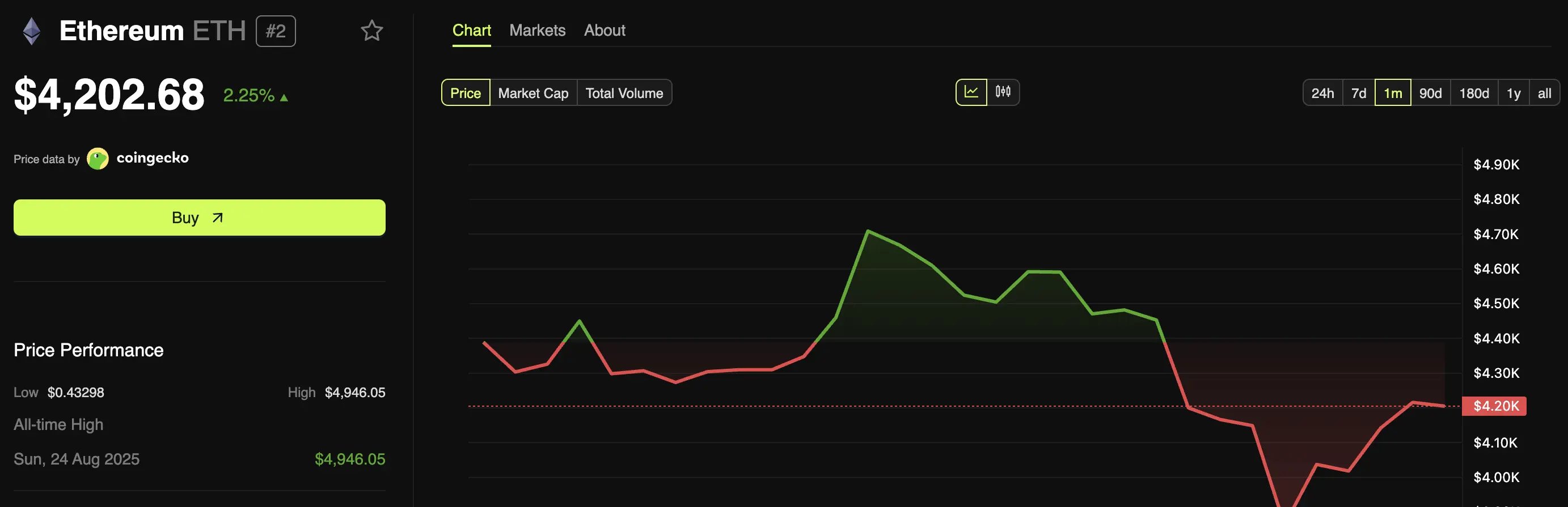 Bu arada, kurumsal bahisler ETH'nin 4.000 $'ın altına düşmesinin ardından yeniden yükselmeye başlamasıyla geliyor. Ancak, altcoin kayıpları tersine çevirmeyi başardı ve yükselmeye devam etti. Basın zamanında, 4.202 $'dan işlem gördü ve son 24 saatte %2,25 arttı.