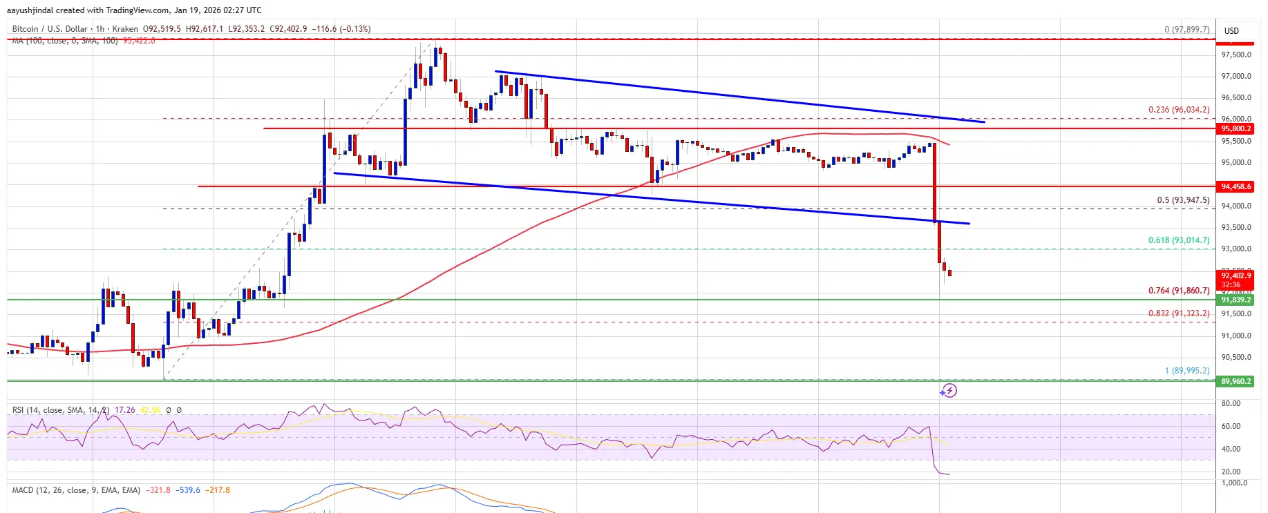 The price even spiked below $92,000. It tested the 76.4% Fib retracement level of the recent wave from the $89,995 swing low to the $97,898 high. Bitcoin is now trading below $93,500 and the 100 hourly Simple moving average.