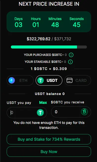 Investors must hold either Ethereum (ETH) or Tether (USDT) in their crypto wallets before purchasing $GBTC. These tokens can be purchased from a suitable crypto platform and transferred to the wallet.