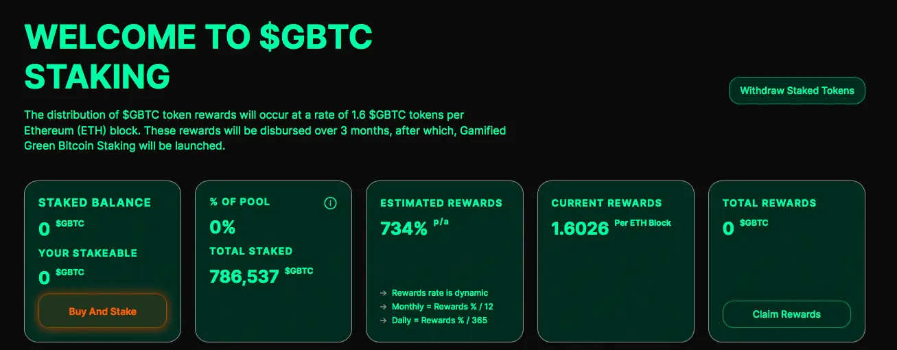 Investors can buy and stake $GBTC and earn up to 734% in staking APYs.