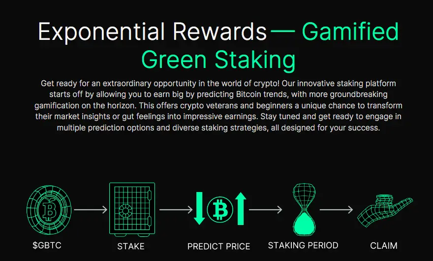 Green Bitcoin will introduce a gamified green staking model – where $GBTC token holders can earn daily rewards. According to the Green Bitcoin whitepaper, the platform will soon launch its own BTC token price prediction game.