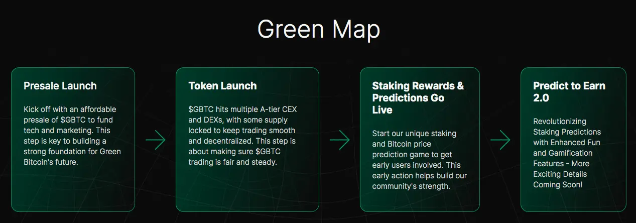 Presale Launch – The current focus is on the ongoing $GBTC presale. With the money raised, Green Bitcoin will fund its tech and marketing to build a strong platform core.
