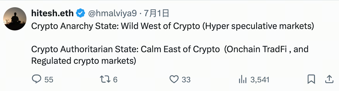 Новий капітал продовжує створювати можливості. Авторитарні системи формують DeFi, стейблкоїни та токенізацію RWA. Анархія — prediction markets, перпетуальні контракти, privacy. Екосистемі потрібні обидва полюси.