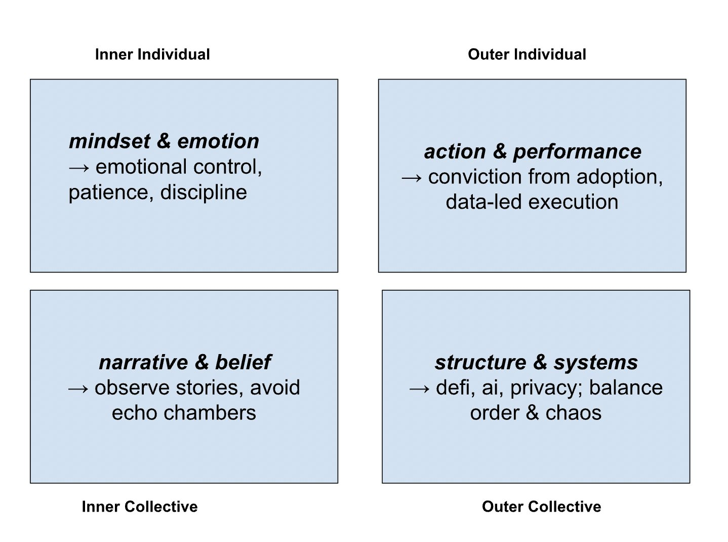 В контексті криптоіндустрії інтегральний підхід відкриває розуміння, що ринки — це не лише графіки й цифри, а живі системи, утворені емоціями, діями, наративами та структурами. Кожна монета, кожен наратив, кожен цикл проходить чотири квадранти свідомості: особиста психологія, зовнішня поведінка, спільна віра та колективна інфраструктура.