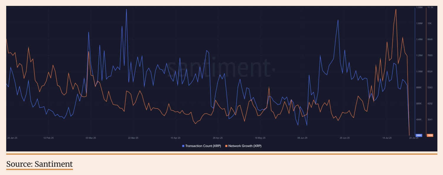 З 18 по 22 липня дані у блокчейні XRP різко зросли, але 24 липня кількість нових адрес різко знизилася до 1899 (зниження понад 80%), добовий об’єм交易 зменшився до 286 тисяч угод. Такий крах активності в блокчейні безпосередньо впливає на логіку підтримки ціни, якщо зростання нових користувачів не зможе швидко відновитися, цей раунд бичачого ринку XRP може бути позбавлений базової підтримки.
