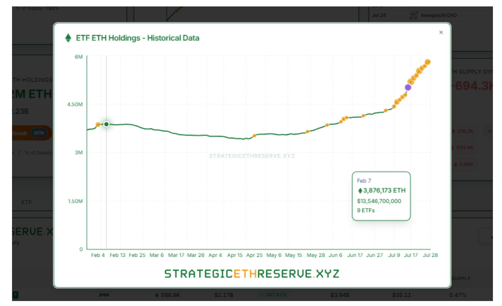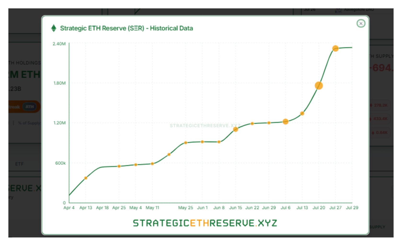 Згідно з даними Strategic ETH Reserve (SER), наразі 6,73% ETH (близько 8,12 мільйона ETH, ринкова вартість понад 31 мільярд доларів) належить компаніям та ETF. Крім того, стратегічний резерв ETH досяг 2,33 мільйона ETH, вартістю 8,9 мільярда доларів, що становить 1,93% від загальної пропозиції. Ці резерви складаються з 65 учасників і з середини квітня демонструють стабільне зростання, особливо з кінця червня спостерігається значне збільшення.