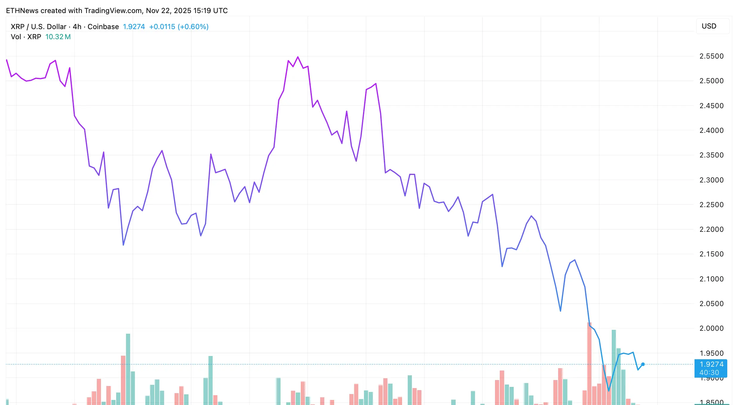 Графік TradingView на 4H виявляє стабільну низхідну траєкторію протягом листопада. XRP встановив повторювані нижчі максимуми та нижчі мінімуми, підтверджуючи постійний тиск продажу.