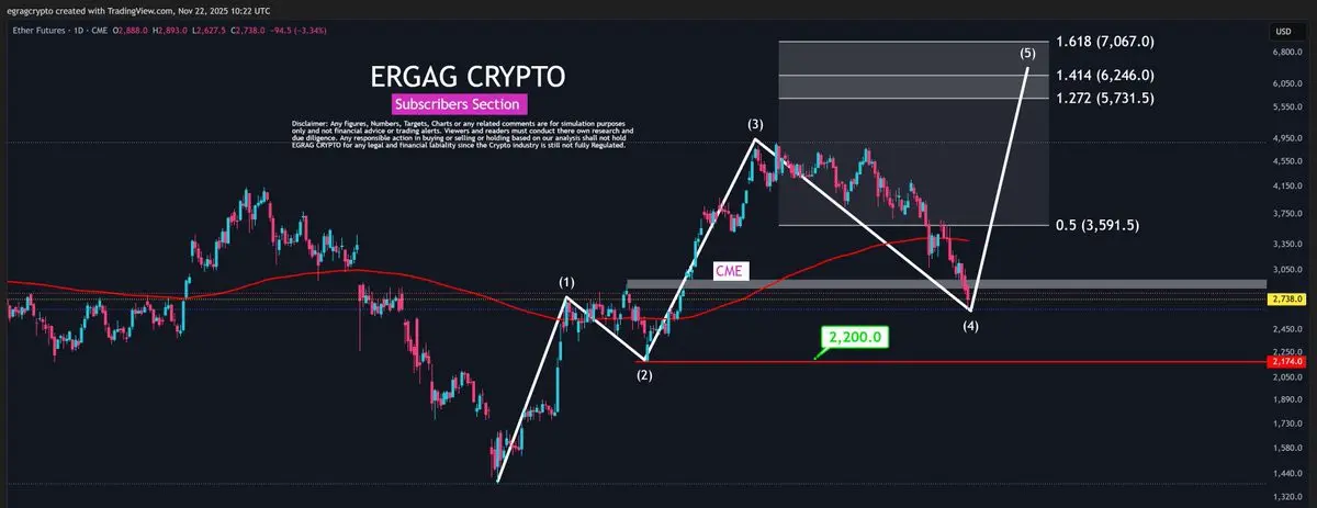 Інтерпретація Egrag Crypto йде в протилежному напрямку, розглядаючи графік у рамках класичної п'ятихвильової імпульсної моделі Елліотта. На його думку, ETH чисто пройшов від Хвилі 1 до Хвилі 2, сильно увійшов у Хвилю 3 і нещодавно завершив глибоке скидання Хвилі 4. Він стверджує, що Хвиля 5 залишається відсутньою, і що ринкова структура все ще підтримує продовження зростання.
