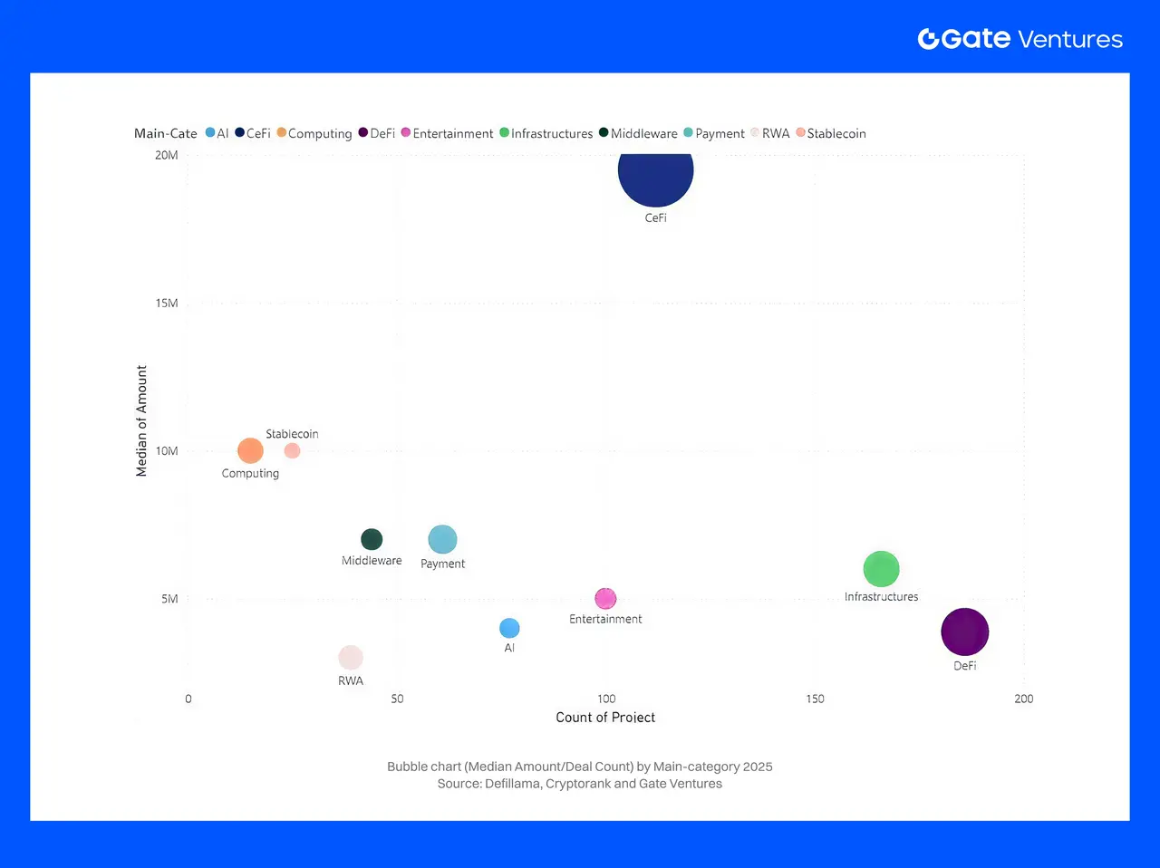 Кореляція за категоріями: мегазделки зосереджені навколо CeFi та інфраструктури — біржі, брокери та основні блокчейн-системи часто залучали понад $100М+. Водночас, розваги та ігри/NFT залишалися у нижчих сегментах, зазвичай менше $5М.