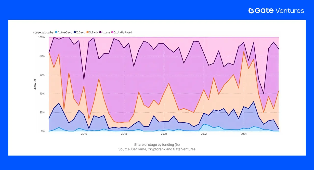 Важливо, що ранні стадії не послабилися. Фонди, орієнтовані на крипто, підтримували активність у Pre-Seed та Seed у 2023–2024 і перейшли до стратегії «бабл»: активні лінії Pre-Seed у парі з концентрованими пізніми раундами. Series A/B, які були тонкими у 2023, знову розширилися у 2025, оскільки зріліші будівельники бичачого ринку повернулися на ринок.