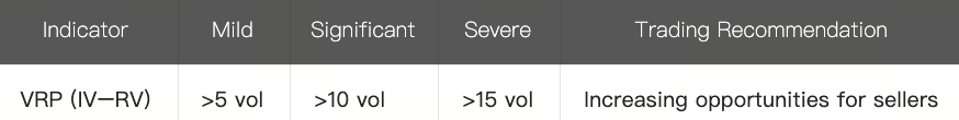Biến động thực tế Bitcoin (BTC) đã phục hồi lên khoảng 40, trong khi VRP (IV−RV) đã thu hẹp còn 2,18 vol, giảm mạnh so với -7,38 vol trong giai đoạn hoảng loạn tuần trước. Hiện tại, biến động ẩn (IV) vẫn cao hơn biến động thực tế (RV), tạo ra VRP dương. Trong bối cảnh này, thị trường đang định giá cho biến động tương lai cao hơn, khiến các chiến lược bán biến động—như Short Straddle, Short Calendar Spread hoặc các cấu trúc Short Vega khác—có thể phù hợp.