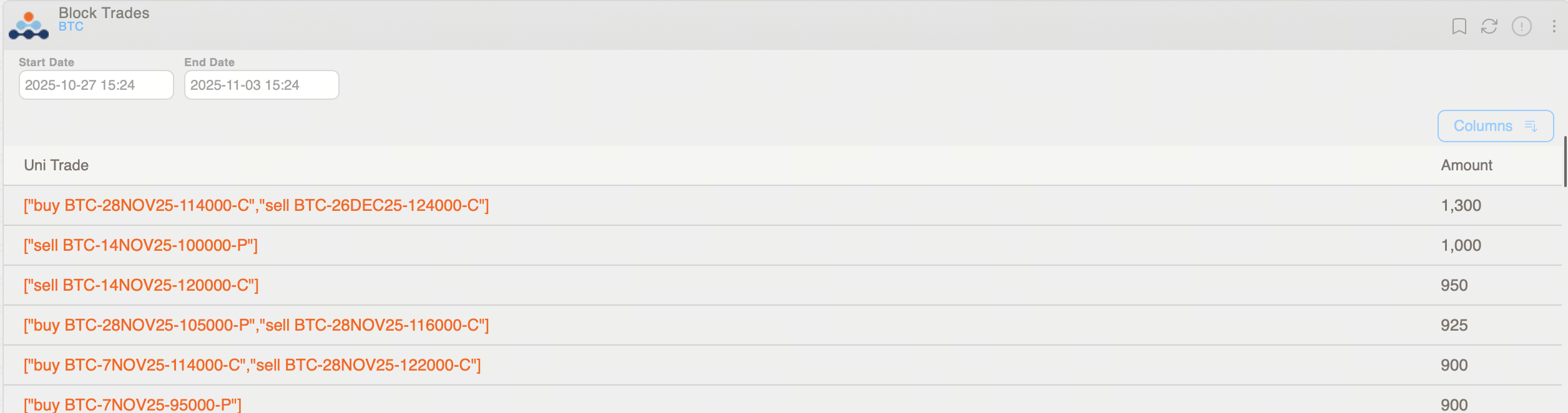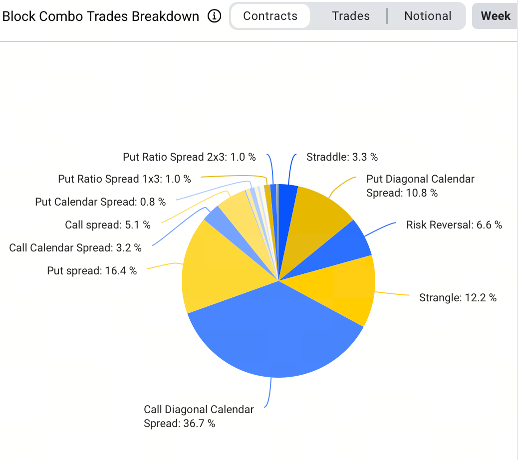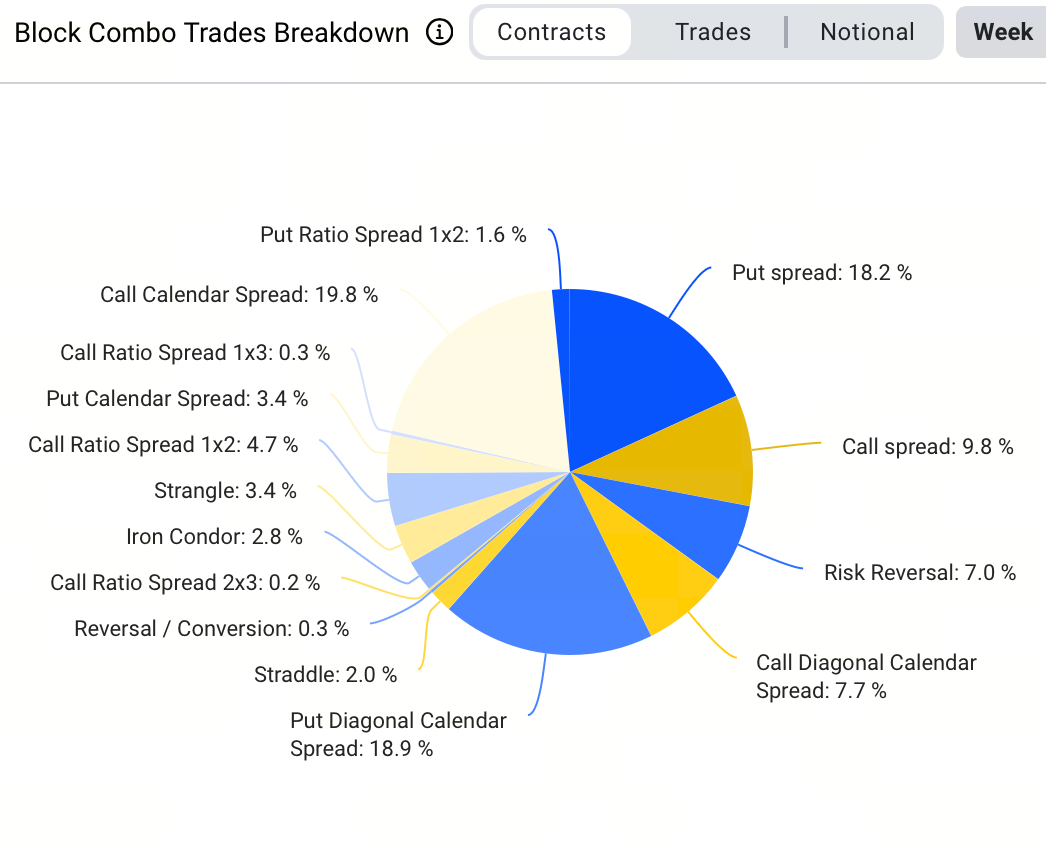 Trong các giao dịch block, chiến lược nổi bật nhất tuần này—chiếm 36,7% tổng số giao dịch—là bullish calendar spread. Giao dịch block lớn nhất liên quan đến 1.300 BTC: mua BTC-281125-114000-C và bán BTC-261225-124000-C theo cấu trúc bullish calendar spread đảo ngược, với tổng phí bảo hiểm $9,2 triệu. Điều này phản ánh đặt cược chiến thuật vào khả năng tăng ngắn hạn đồng thời bán biến động.