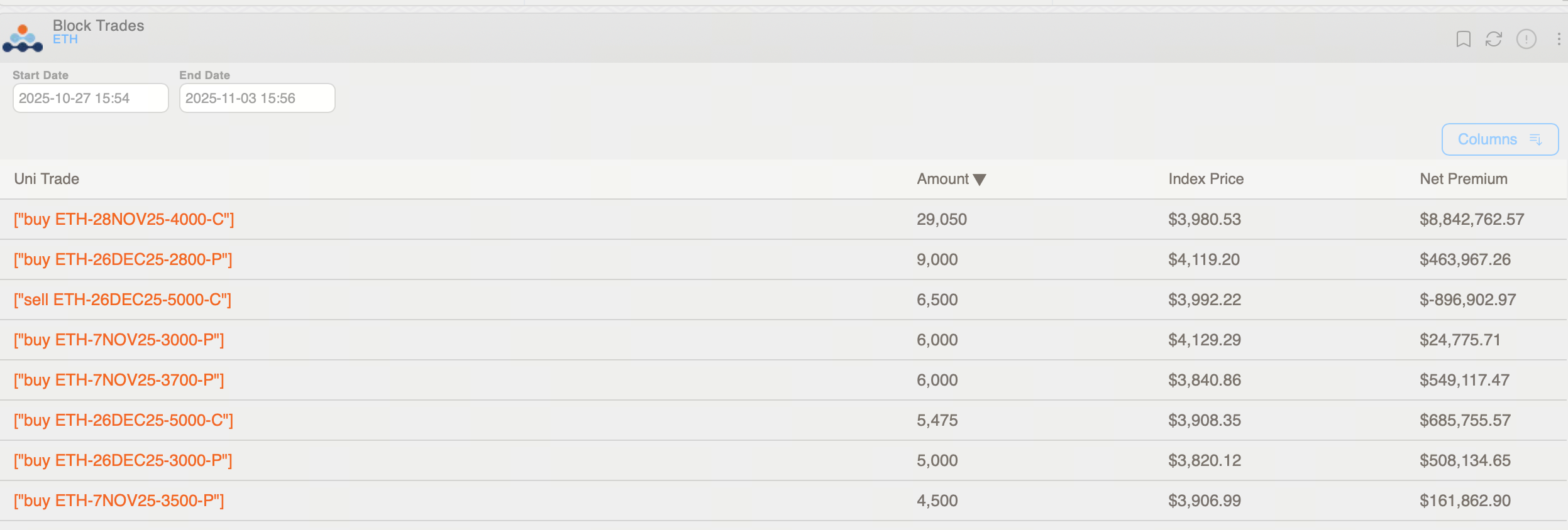 Trong các giao dịch block, chiến lược phổ biến nhất tuần này, chiếm 18,9% tổng số giao dịch, là calendar put spread—thể hiện xu hướng ưu tiên vị thế giảm giá dài hạn với chi phí thấp. Giao dịch lớn nhất là bán 3.000 ETH hợp đồng ETH-071125-3700-P và mua ETH-261225-3700-P. Đồng thời cũng ghi nhận một giao dịch tăng giá ngắn hạn nổi bật với việc mua 29.000 hợp đồng ETH-281125-4000-C, tổng phí bảo hiểm $8,84 triệu.