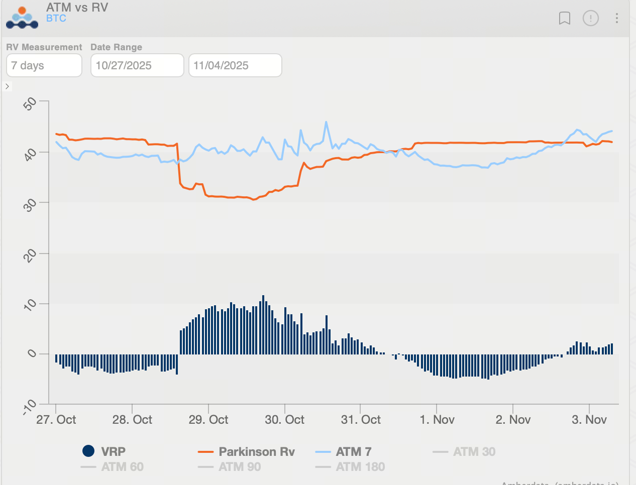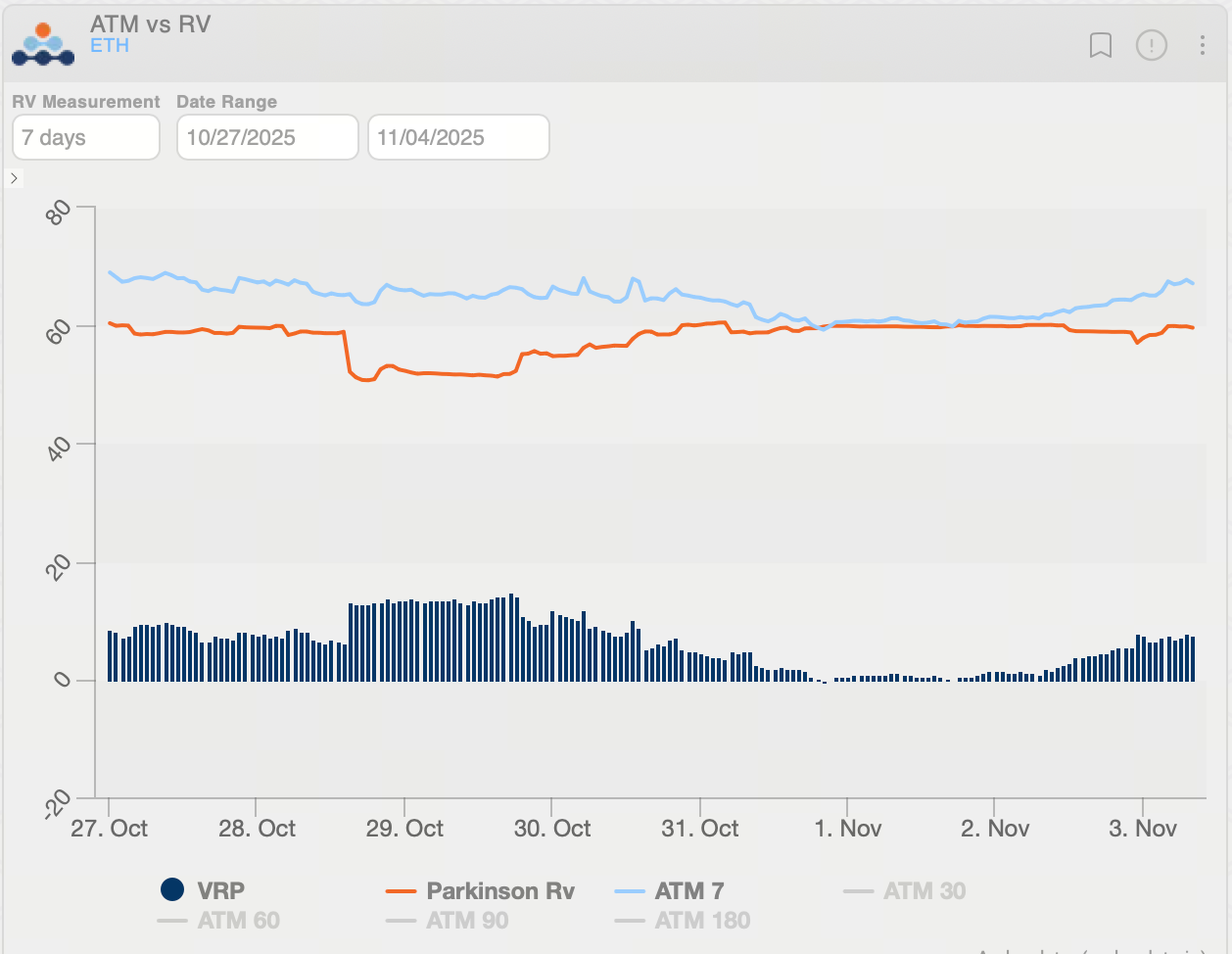 Biến động thực tế Ethereum (ETH) đã giảm về khoảng 60, trong khi VRP (IV−RV) tăng lên 7,52 vol. Điều này cho thấy khi khẩu vị rủi ro gần đây gia tăng, biến động ẩn ngắn hạn cũng tăng. Với IV cao hơn RV, thị trường đang định giá cao cho biến động tương lai. Trong bối cảnh này, các chiến lược bán biến động—như tạo lợi suất Theta thông qua bán cấu trúc quyền chọn hoặc xây dựng vị thế Short Vega—có lợi thế tương đối.