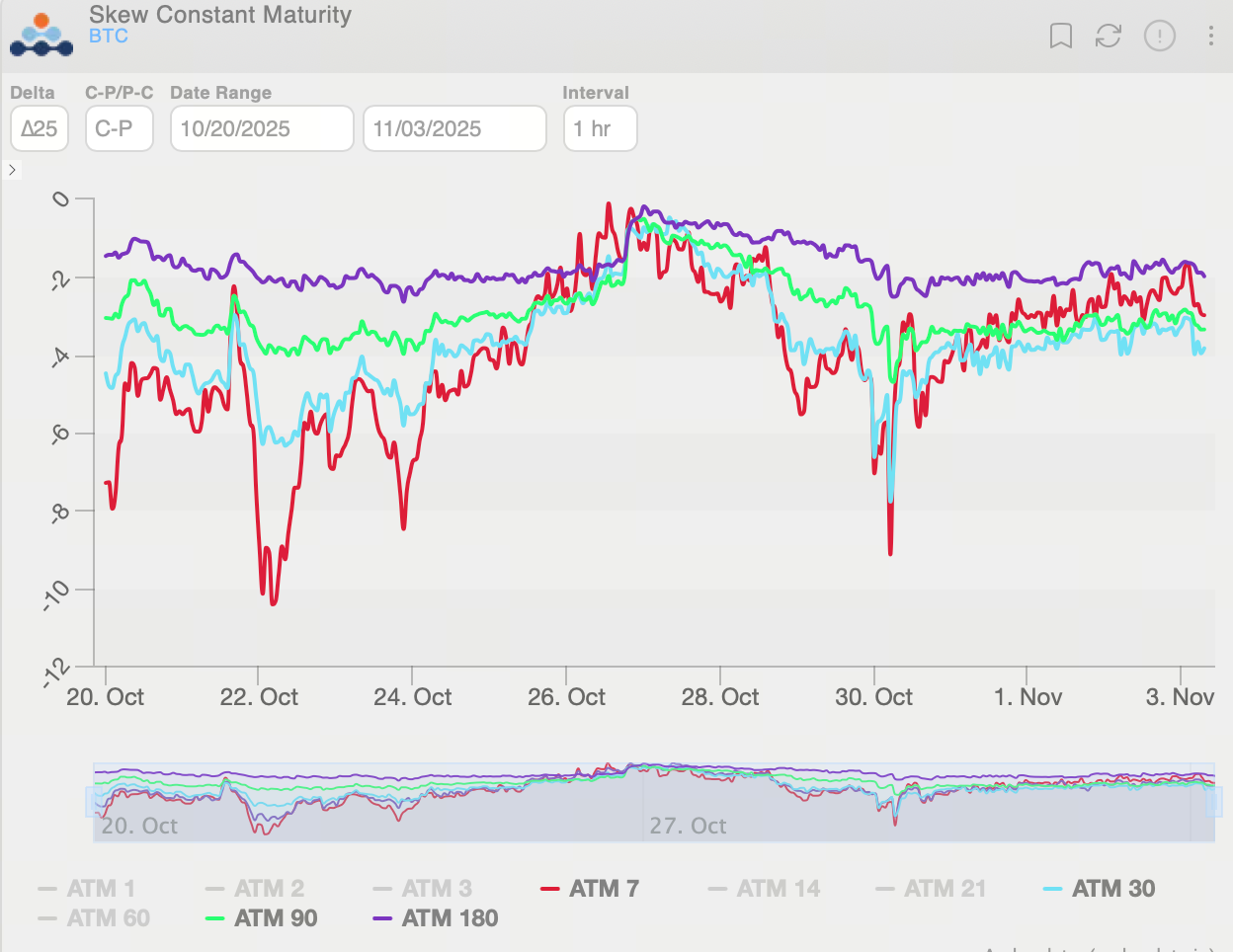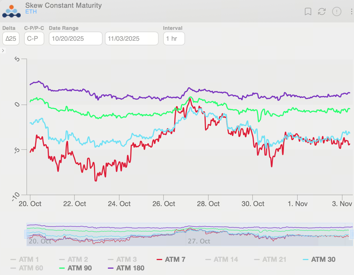 Chỉ số Skew 25-Delta quyền chọn BTC duy trì âm trong suốt tuần, phản ánh nhu cầu phòng ngừa rủi ro giảm giá liên tục. Đường cong skew trở nên phẳng hơn, cho thấy nhu cầu phòng ngừa rủi ro giảm giá ngắn hạn tăng mạnh.