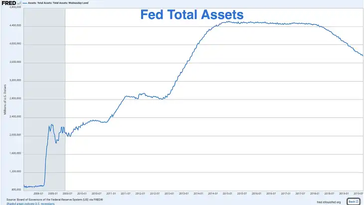 Vào cuối năm 2019, tổng tài sản của Cục Dự trữ Liên bang bắt đầu tăng là nhờ vào chính sách nới lỏng định lượng, máy in tiền bắt đầu hoạt động.