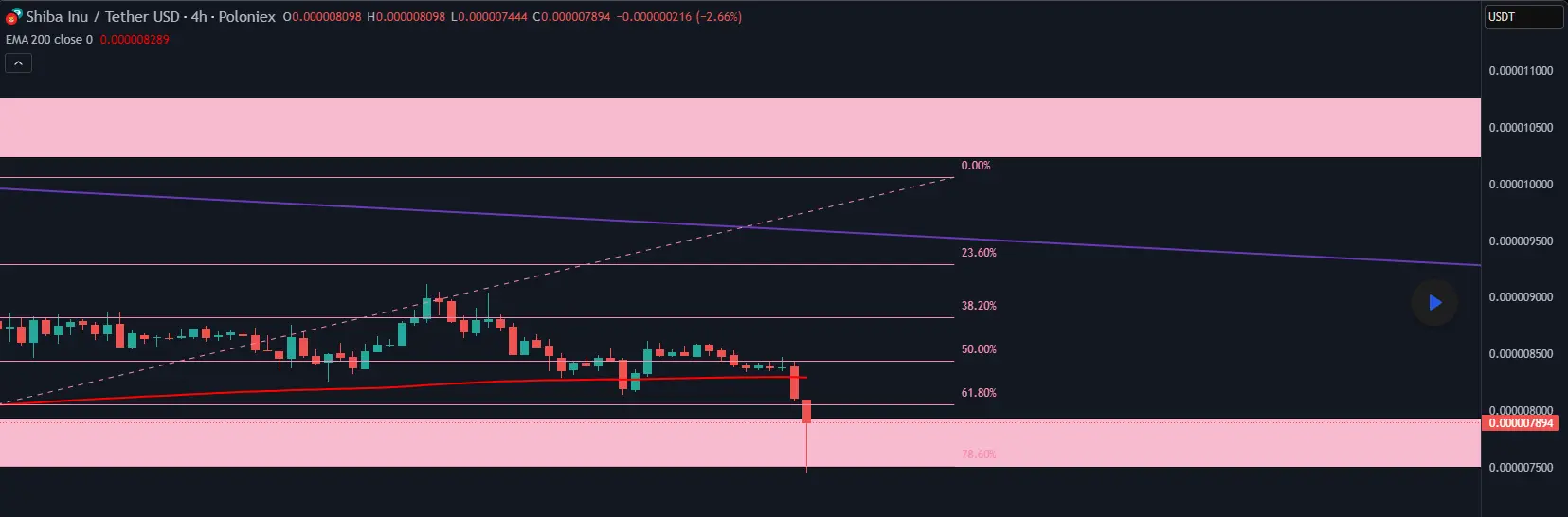 Trong xu hướng giảm, Shiba Inu đã chạm mức Fibonacci 0.786 trên khung thời gian 4 giờ.
