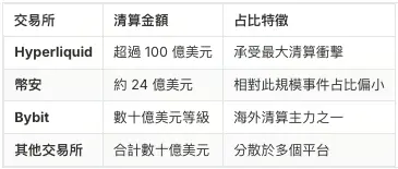 這次黑色星期五清算事件最顯著的特徵,是清算高度集中在海外交易所。Hyperliquid 吸收了最大的清算量,而 CEX 的份額比這種規模事件的典型分佈要小得多。