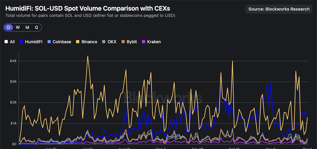 HumidiFi不僅主導了Solana DEX的交易量市場份額,還在現貨SOL-USD交易量上超越了大多數CEX。HumidiFi的日均SOL-USD交易量超過$1 億,最近超越了某些主要交易所,成爲了頂級交易場所。HumidiFi自6月推出以來迅速崛起,展示了核心團隊在做市商AMM設計方面取得的驚人進展。