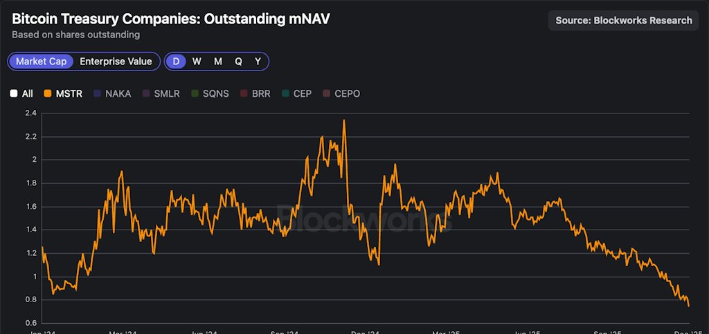 在11月初,出色的mNAV比率跌破1,現在正滑向0.75,清晰反映了當前的風險規避環境。這種動態引發了對潛在級聯效應的擔憂,因爲這些工具如果股票持續以折扣交易於基礎資產,可能會放大回撤和被迫拋售。