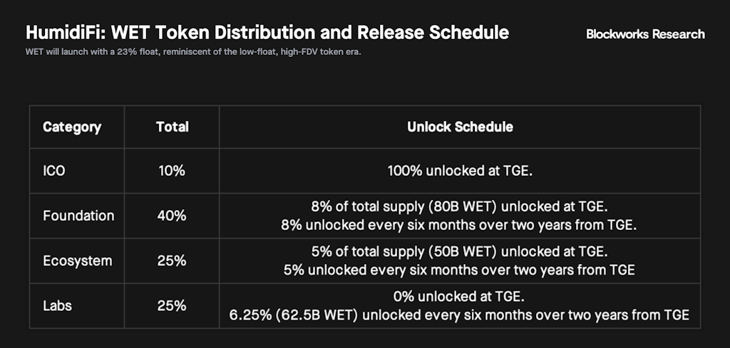 WET的代幣分配顯示10%分配給ICO參與者,其餘90%分配給零位置基金會(40%)、生態系統(25%)和實驗室(25%)。可以推測,基金會將由Temporal運營,盡管公告從未將零位置的運作歸屬於任何特定實體,導致在ICO前一天未披露此信息。實驗室的分配可能也指Temporal,因爲它作爲HumidiFi的核心工程貢獻者。