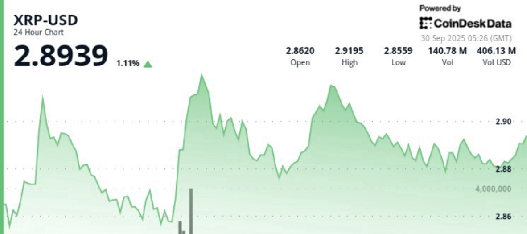 在9月28日21:00至9月29日20:00的24小时交易时段内,XRP上涨了2.1%,从$2.84升至$2.90,波动范围为$0.10,占开盘价的3.47%.