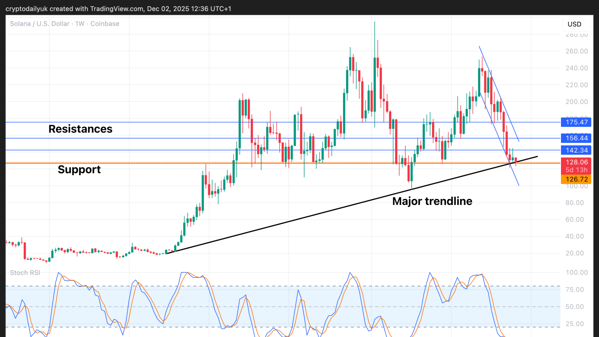 $SOL 价格的周视图确实看起来非常看涨。$126 水平支撑位极为强劲,而价格在主要上升趋势线的同时达到了这一水平,这将大大指向从这里的强劲反弹。