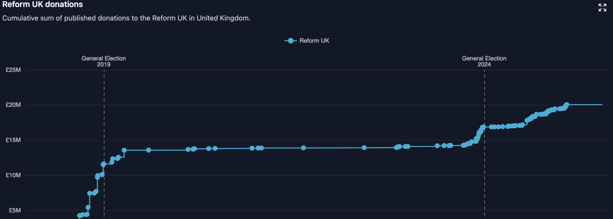 捐款追踪器 DonationWatch 记录自该党作为脱欧党成立以来,已筹集超过 2000 万英镑 ($26 million) 的捐款。目前尚不清楚其中有多少是通过加密货币进行的。