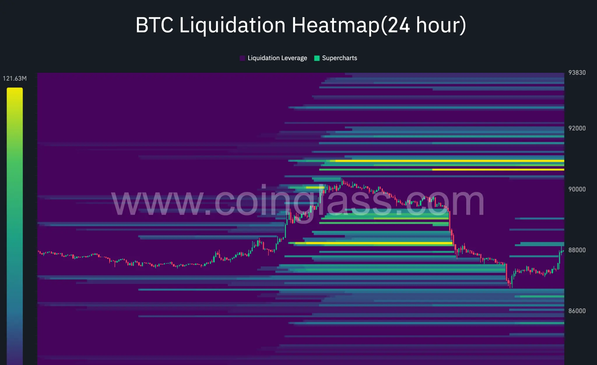 从技术角度看,这一地缘政治的激增使比特币进入了24小时清算热图上可见的高密度“流动性磁铁”。