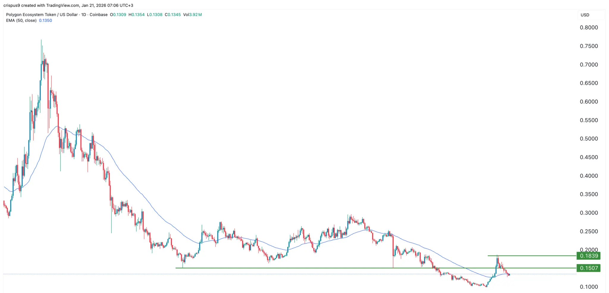 日线图显示,POL价格已从年初至今的高点0.1840美元回落至当前的0.1343美元。价格已跌破关键支撑位0.1500美元,这是去年四月的最低点。